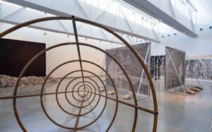 Katarina Weslien’s installation, “I Forgot to Remember,” at the Maine Center for Contemporary Art (CMCA) through May 4th is reminiscent of a contemporary stage set where the actors are also the audience, and the set speaks to both formal abstraction and a densely layered narrative. Like Vsevolod Meyerhold’s c1922 Cubo-Constructivist set for his Moscow production of Fernand Crommelynck’s “The Magnificent Cuckhold,” Weslien’s austere yet multi-tasking components are in conversation with each other; soliloquies included. Cone, cube, plane and linear elements intersect, coalesce and interrupt through multiple themes, variations and historical associations. A large, open-frame tubular-steel cone visually funnels viewers into the gallery space where a black cube rises from a corner littered with small remnants of clothing and fabric scraps, readied for recycling and re-use. Mysterious, free-standing panels create a central tent-like space or open room-within-a-room structure, while a thick hemp rope, like a line-drawing, meanders along the floor of an otherwise blank wall, attached to a bronze ship’s bell mounted some twenty feet above. Disparate elements connect while remaining starkly independent. Somehow familiar, there is an initial impression of remembrance, a space of collective consciousness and universal dreams.
