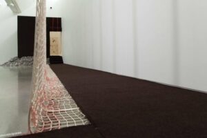 Across from the main gallery entrance—at the diagonally opposite corner of the gallery entrance-a cushioned, black-felt walkway on the floor abuts the length of the gallery’s back wall. This felt path is flanked along its entire length by a floor to ceiling, 25-foot-high mesh net. This massive, segmented laser cut felt net is composed of several large sections hand-knotted together. It provides a loosely gridded screen between the felt footpath and the back gallery wall. For Weslien who has long studied Buddhist philosophy, this netting may also allude to Indra’s net, hung at the world axis between Buddhist and Hindu religions. Also known as Veda’s net, Indra’s net is a metaphor for concepts of emptiness, independent origination, and, perhaps, most tellingly, suffusing and holding all worldly matter and energy. Indra’s net is often described as the “perfect interfusion,” each interstice containing reflections of all the stars of the universe including its own infinitude. Like the mylar blankets, the net breathes visitors’ shadows of random movement against the back wall.