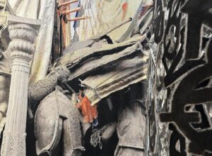 It is telling that Weslien likes the strangeness and visual sensation that the backs of the tapestry panels provide, first encountered by visitors entering the gallery, like abstractions— Franz Kline or De Kooning paintings (that sometimes included buried newsprint images). Only upon entering the enclosing “tent” space composed of free-standing panels do we understand that each of the four corners of the tapestry room are connected by the artist’s disparate memories of travel, childhood, pilgrims’ progress through sites of man-made and environmental disruption and disaster. My own associations turn on the seemingly eclectic mixture of images and materials throughout the installation—shredded piles of textile remnants perhaps recalling the pulsing tens of millions of participants gathered together for ancient religious festivals. There is the strangeness of other gods, the multiplicity of humanity held in place by reason of loosely shared belief systems. For Weslien, she is consciously, “thinking more about migrating people who are on the move because of political and environmental reasons, making do as they find whatever is at hand.”
