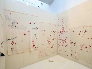 In her poignantly personal installation art—and especially with a consciousness of our own footsteps, perhaps—ideas formed from individual pilgrimage accumulate, are collected, become space for memories of travel, both physical and in remembered dreams. The interior of the black exterior cubical-shaped room is equipped with beige blankets hung on the interior walls. Small red crosses are hand-stitched and scattered, seemingly randomly across each of the interior blankets. The red crosses are meant to document real and metaphorical “repairs” for tears and holes in the fabric. Light yellow outlines appearing to stain the cream-colored blankets are faintly stitched to outline the wear of the blankets over time. Made in rural Nova Scotia, these simple, warm blankets were once hand-woven from left-over wool clippings. The small, white interior of the felt room is designed to be a place of memory, silence, and meditation. Weslien thoughtfully provides small head pillows sewn onto the softly cushioned floor of the room. The artist notes, “The material of felt absorbs sound. This 10’ x 10’ structure is covered inside and out and covers the floor with felt for that very purpose. I hope that as you cross the threshold, you feel the shift, a haptic shift…” Quietude is real and literally felt.