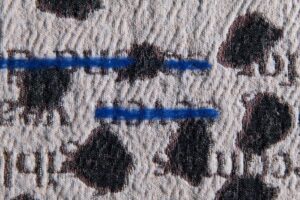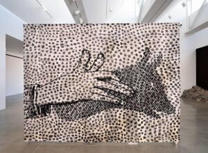 Images on Weslien’s tapestries range from children’s shadow puppet figures of a dog or wolf to an upside-down man on a stool next to newspaper columns culled from an actual printed page–also upside-down and illegibly reversed, a mirror-image of the original newspaper or printed source material. One of the three jacquard loom panels, “Upside Down Man” is covered with small, needle felted dark grey and blue patches—like dirty snowflakes or volcanic ash strewn across an empty landscape. These patches interrupt representational coherence and illusion while unifying the seemingly unrelated panels. The needle felted patches bring back the machine-loomed panels to handwork, with the tedious repetition and irregularity of one-stitch at a time individual labor and touch.