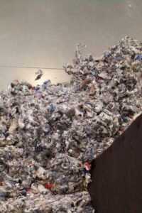 Shredded textiles surrounding the exterior of the black felt room