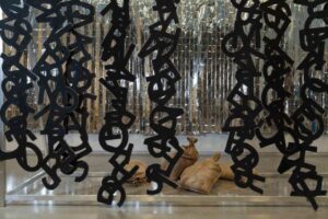 Another wall panel appears to be about deconstructing language. This panel holds long black strips of flat, interlocking, block-like felt letters. The individual letters are opaque (black-painted felt), approximately six-inches tall and individually laser-cut. Like an oversized charm bracelet, each strip repeats the phrase “I forgot to remember this is the time of monsters,” a non sequitur from a phrase attributed to the Italian Marxist, Antonio Gramsci: “The old world is dying, and the new world struggles to be born: now is the time of monsters.” Now is the time of monsters, indeed. They are roaming throughout an installation of hanged letters, upside-down men, illegible newspapers, detritus, rags, and a giant, metal-framed cone, like a never-to-be filled cornucopia. Gramsci is among myriad artists, past and present, philosophers, comparative world religious traditions and history informing Weslien’s deeply layered, vastly intelligent and pointedly ricocheting artworks loosely gathered from over five decades of her long, thoughtful practice.