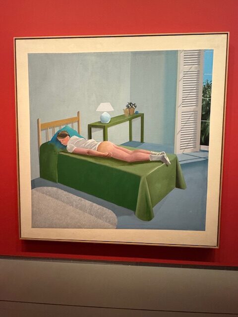 During Hockney’s time in France, fauve colors began to appear, a seeming homage to one of his favorite artists, Van Gogh. For example, Winter Timber, 2008, oil on canvas, Untitled, 22 July 2005, 2005, and Vincent’s Chair and Pipe (La chaise et la pipe de Vincent), 1988. There is also a nod to Cezanne as in A Bigger Card Players (Les Joueurs de Carte en Plus Grand Format), 2015, and to Monet in Giverny by DH, 2023. Two recent paintings, After Blake ((2024) and After Munch (2023) with the title Less Is known Than People Think finish out the arch of the show at the Louis Vuitton Foundation.