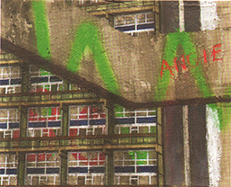 For this writer the discovery of David Helper was a treat This small painting 37 X 45 cm titled Angie 11 Depicts a concrete motorway ramp diagonally cutting across the picture leaving a back ground view of Post War Block of flats. Graffiti adorns the ramp, green linear triangles with the word Angie written in red graffiti on one side. The claustrophobia of modern Urban living is here, or better still the underbelly of town planning. The graffiti of the self made vox populi of the people drives home a poignant visual essay. David Helper captures or hints at a narrative outside the moment of the picture.