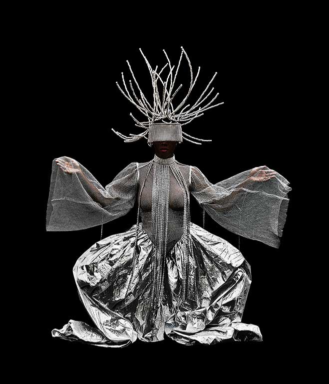 Born In New Jersey, resident in Brooklyn, Paris, and Johannesburg, adopted into her larger family in Accra, Ghana, the quadrilingual artist has researched fashion history, history of photography, Afrofuturist philosophy and African religions and myths to create this project fusing video, photography, anthropology and fashion, both creating the costumes she wears in photographic digital prints, and the story of the culture she has invented and illustrates. Introduced by a video screen of the sea’s gentle waves surrounding an African woman in the Atlantic Ocean, having survived a shipwreck of a vessel carrying pregnant women from Africa for enslavement in the Americas, Jackson proceeds to show us photographs of those women in dress adapted from sixteenth century African and French, British, Netherlandish, and Portugese origins.