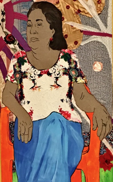 It seems such an unforgivable loss that we have the artist there but technical problems are preventing her words from reaching us. Nowadays regrettably we are not given a little booklet but there is a lot of information online and on the wall and a video with snatches of gypsy music. The book is not arriving to buy until the end of October. It’s an impressive looking show of large figurative works made with brightly coloured fabrics, some with 3D relief or attached jewellery.