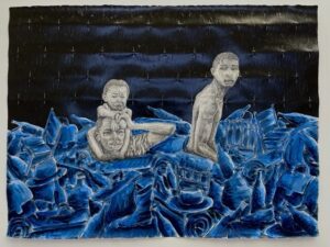 We see in “Golden Wall” (2022) made on paper of gold leaf, ink, acrylic metal pins, hands holding medieval weapons, images of beds, purses, shoes, blankets, chairs, and eyes, drawn on these objects, all seeing eyes, but also a homage to surrealism and the Mexican surrealist muralists. We see in “Silver Worlds” (2023) on paper of aluminum leaf, metal pins, acrylic and ink, opposing worlds, one half sphere emerging from the bottom of the paper, the other half sphere downward facing from the top, with a sphere of faces and chairs and the usual debris depicted by Zelenka but supported by five swordlike-like rods. We see the same sphere, this time whole, in “Circle of Power” hands holding rodlike weapons at five points emerging from the sphere into a black void. This time objects within the sphere have stringed instruments, as well as hats and chairs and ubiquitous eyes. The parched earth surrounding the black void could be the deserts crossed, or the dry earth indicative of droughts in immigrants’ countries causing them to flee. The drawn white boots, with eyes on the path, spikes sticking out of toes, marching on the parched earth in another drawing opposes the four leg-like bones on either side of the path. “Gold Diggers” (2022) of gold leaf, ink, acrylic and metal pins on paper shows the same sphere, the same weapons, the same parched earth letting us know that there are many reasons people immigrate, and many economic classes. Yet, “Living in Luxury” (2022, used architects’ paper, used clothes, newspaper, acrylic, and ink on paper shows two women. I see a mother and daughter, with the mother on her knees buttoning the school uniform her daughter wears, showing that even, living in poverty, the dignity and importance of sending the child to school. A bed is drawn under the globe holding the women, representing their new home, no longer on the migratory voyage, and two blackbirds fly above. The birds, looking like ravens fly above, still threatening their future. The threat is always there, whether rats, or ravens, or water or drought.