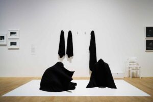 Ono’s family moved to America, and, after a year as the first female Philosophy student at a Japanese university, she transferred to Sarah Lawrence College, then as now a mecca of artistic activity. She dropped out. That’s too bad: her work’s one weakness is dependence on platitudes and easy answers to big problems, which is exactly what college-level critical-thinking complicates. I’m sure that at the time she had to contend with unimaginable degrees of sexism, xenophobia, and what Edward Said had yet to name Orientalism, but college still might have armed her with tools to effectively subvert all the institutions that her art protests. After college, she joined various art collectives. Clearly, she was looking for an intellectual community. Her early instruction art pieces used the medium of the typewriter to give scripts to audience members, telling the public how to make her art, and how to make it their own. One of the best of these is ‘Bag Piece’, in which people are told to envelop themselves in gigantic black satin (I think?) bags and stand, one or two at a time, on a white platform in a bright spotlight in front of the white gallery wall. They become living sculptures. As reconstructed by the public at the Tate, Bag Piece is fascinating. I can see how it anticipates performance art by the equally conceptual but far more popular Swiss mime troupe Mummenschantz.