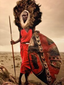 wonderful Maasai warrior from Serengeti, Tanzania, one of the most beautiful young men Nelson has ever met, is portrayed against the backdrop of an arid landscape and under a leaden sky, with his flame red robe and shield.