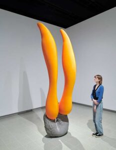 Continuing a show about transformation of forms. Eve Fabrega’s Pumping, a series of tangled mesh tubes stuffed with massage balls, resemble entangled snakes, who might have swallowed a small creature, creating a parasitic, combined being of two life forms. The electronic, vibrating soundtrack, like a strange heartbeat, lends credence to the swallowed, trapped, struggling, echoing being I imagine inhabiting the “snake’s” body. Fabrega is quoted in the catalogue to the exhibition (pg. 6)” I see my work as creatures that can help us imagine other possible bodies.” Holly Hendry connects the industrial with the architectural, commenting on environmental nemesis with her Deep Soil Thrombosis. (2019) Stuffing and clogging pipes with plaster, jesmonite, foam, marble, and concrete, stopping the flow of air or liquid, she alludes to our world clogged with chemicals, CO2, sand, smog, stopping air and water flow. Hendry’s Slackwater, (2023) a geometric network of steel ducts mimics interconnecting, crossed tidal lines and flowing river water, creating a woven pattern. Environmentally aware, Choi Jeong Hwa transforms cheap objects into botanical forms, creating beauty from cheap throwaways. He describes his pagoda like tall columns called “stupas” as holobiont; systems of organisms living together. They present as flower or plant-like repeated forms of varying colors and variegated sizes on vertical columns, creating, for me, trees.